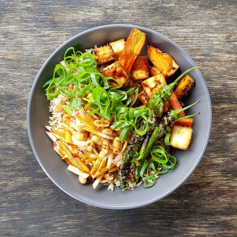 Miso roasted carrot and tofu with peanut apple slaw, brown rice, quinoa and charred chili