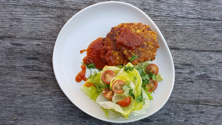 Corn fritters with salsa, wedge salad with apple, green beans and lime dressing
