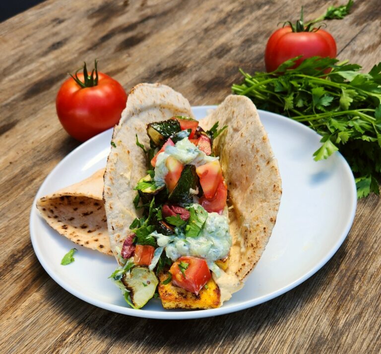 Tofu gyro, tzatziki, hummus, fennel, olives and parsley