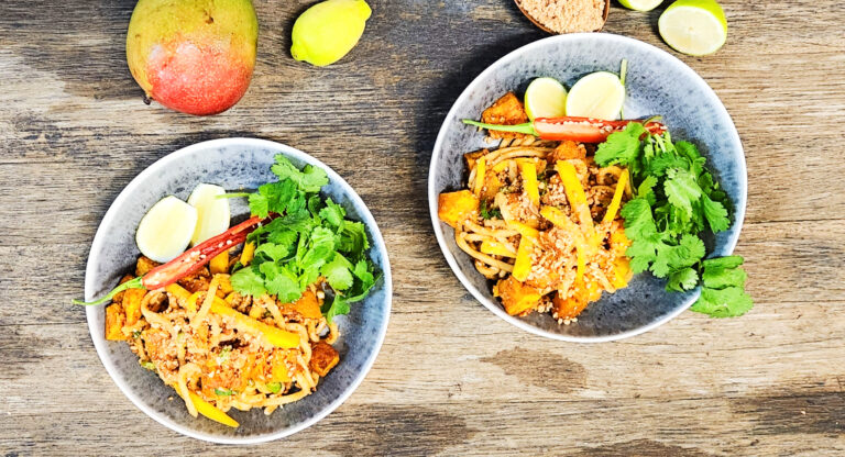 Pad Thai noodle salad, roast butternut squash, udon noodle, lime, orange, crushed peanuts, coriander and chili