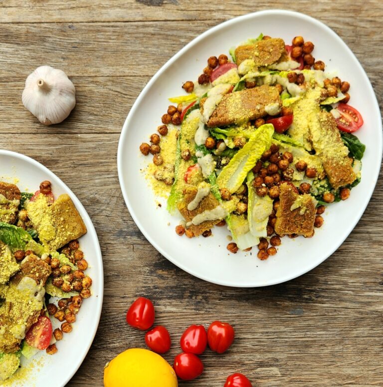 'Chicken' Caesar salad, spiced chickpeas, cos lettuce, cashew parmesan with caper garlic dressing