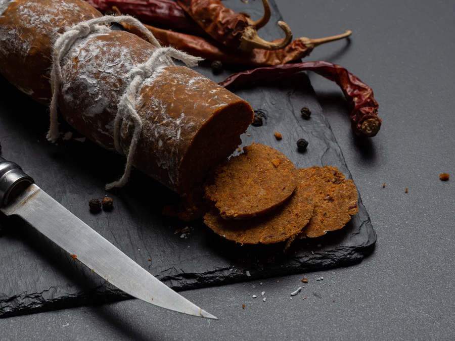 This seitan Sopressata is a show-stopper on a vegetarian platter. Spicy, peppery, slightly firm, decadent. Handmade in Otautahi and part of our plant based charcuterie collection. This is designed to be eaten cold on platters but can also be cooked. When crumbled it becomes the most delicious ragu you’ve ever had!
